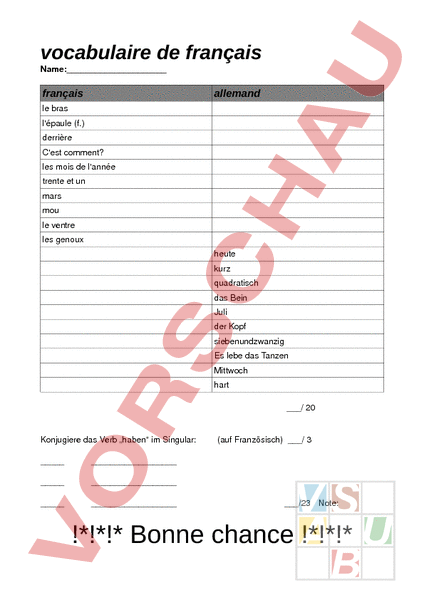 vocabulaire de français Name:_ français allemand le bras lépaule (f.) derrière Cest comment? les mois de lannée trente et un mars mou le ventre les genoux heute kurz quadratisch das Bein Juli der Kopf siebenundzwanzig Es lebe das Tanzen Mittwoch hart/ 20 Konjugiere das Verb „haben im Singular: (auf Französisch)/ 3/23 Note: !*!*!* Bonne chance !*!*!*
