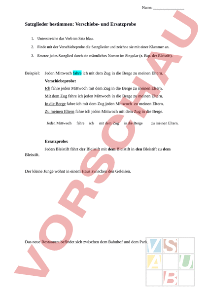 Name: Satzglieder bestimmen: Verschiebe- und Ersatzprobe 1. Unterstreiche das Verb im Satz blau. 2. Finde mit der Verschiebeprobe die Satzglieder und zeichne sie mit einer Klammer an. 3. Ersetze jedes Satzglied durch ein männliches Nomen im Singular (z. Bsp. der Bleistift). Beispiel: Jeden Mittwoch fahre ich mit dem Zug in die Berge zu meinen Eltern. Verschiebeprobe: Ich fahre jeden Mittwoch mit dem Zug in die Berge zu meinen Eltern. Mit dem Zug fahre ich jeden Mittwoch in die Berge zu meinen Eltern. In die Berge fahre ich mit dem Zug jeden Mittwoch zu meinen Eltern. Zu meinen Eltern fahre ich jeden Mittwoch mit dem Zug in die Berge. Jeden Mittwoch fahre ich mit dem Zug in die Berge zu meinen Eltern. Ersatzprobe: Jeden Bleistift fährt der Bleistift mit dem Bleistift in den Bleistift zu dem Bleistift. Der kleine Junge wohnt in einem Haus zwischen den Geleisen. Das neue Restaurant befindet sich zwischen dem Bahnhof und dem Park. Am liebsten tanzen die Töchter des Königs durch den Ballsaal. Die Sommerferien verbringt Theo mit seiner Schwester und einem Freund in Skandinavien. Unser Nachbar hat einen grossen Swimmingpool im Garten.