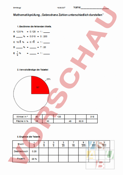 mhänggi Name: 16.09.2007 Mathematikprüfung „Gebrochene Zahlen unterschiedlich darstellen 1. Bestimme die fehlenden Werte. 12.5 0.125 1 0.015 3 200 16. 6 0.1 6 1 7 20 1 4 1 2. Vervollständige die Tabelle! Winkel in 90 Fläche in 25 135 315 30 45 62.5 3. Ergänze die Tabelle. Bruch 1 4 3 5 3 8 3 20 7 40 9 200 9 500 5 800 Dezimalbruch 0.25 0.6 0.375 0.15 0.175 0.045 0.018 0.00625 Prozent 25 37.5 15 17.5 4.5 1.8 0.625 mhänggi Name: 16.09.2007 4. Ergänze die Tabelle. Gewichte 5 kg Anteil in 40 1.5 kg 100 10 1g 60 0.2 5. Ordne die Zahlen a, b, c, d, e, f, nach ihrer Grösse. Beginne mit der kleinsten. 5 6 0.83 83.3 83. 3 8.3 0.83 80 (grösser als)