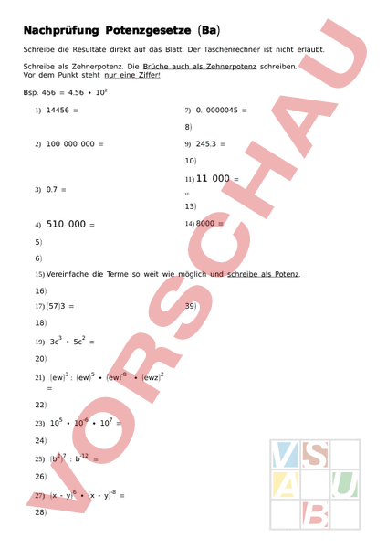 Nachprüfung Potenzgesetze Ba) Schreibe die Resultate direkt auf das Blatt. Der Taschenrechner ist nicht erlaubt. Schreibe als Zehnerpotenz. Die Brüche auch als Zehnerpotenz schreiben. Vor dem Punkt steht nur eine Ziffer! Bsp. 456 4.56 102 1) 14456 7) 0. 0000045 8) 2) 100 000 000 9) 245.3 10) 11) 11 3) 0.7 000 12) 13) 4) 510 000 14) 8000 5) 6) 15) Vereinfache die Terme so weit wie möglich und schreibe als Potenz. 16) 17) (57)3 39) 18) 3 2 19) 3c 5c 20) 3 5 21) (ew) (ew) (ew) -8 22) 5 23) 10 10 -6 7 10 24) 2 7 25) (b : -12 26) 6 27) (x y) (x y) 28) -8 (ewz) 2 29) 3 1z 1z2 30) 0 3 31) 2 2 2 1 32) 3 2 33) 7n 8nm 34) 35) 1x -3 36) 37) 38) 40) Rote Blutkörperchen besitzen einen Durchmesser von ungefähr 7.5 10 -5 mm. Gib dieses Mass in cm an. Schreibe das Resultat als Zehnerpotenz auf. 41) 42) 43) 44) 45) 20) In 1kg Ackerboden leben 25 Milliarden Bakterien. 46) Wie viele Bakterien leben in 3 kg Ackerboden? Schreibe das Resultat als Zehnerpotenz auf. 47) 48)