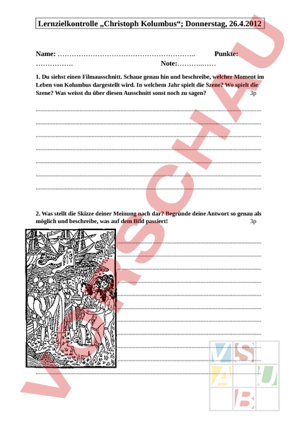 Lernzielkontrolle „Christoph Kolumbus; Donnerstag, 26.4.2012 Name: Punkte: . Note: 1. Du siehst einen Filmausschnitt. Schaue genau hin und beschreibe, welcher Moment im Leben von Kolumbus dargestellt wird. In welchem Jahr spielt die Szene? Wo spielt die Szene? Was weisst du über diesen Ausschnitt sonst noch zu sagen? 3p . . . . . . . 2. Was stellt die Skizze deiner Meinung nach dar? Begründe deine Antwort so genau als möglich und beschreibe, was auf dem Bild passiert! 3p . . . . . . . . . . . 3. Vier der folgenden acht Aussagen sind richtig. Welche? Kreuze die RICHTIGEN an!! 4p Christoph Kolumbus wurde mit seiner Idee, in westlicher Richtung über den Atlantischen Ozean zu segeln, vom portugiesischen König abgewiesen. Auch die spanische Königin Isabella wies Kolumbus ab. Kolumbus war überzeugt, dass die Erde eine Scheibe war. Kolumbus segelte von Spanien aus zuerst zu den Kanarischen Inseln, bevor er von dort aus in westlicher Richtung in See stach. Kolumbus fand auf den neu entdeckten Inseln haufenweise Gold und andere Reichtümer, die er nach Spanien bringen konnte. Kolumbus entdeckte zuerst das Festland des heutigen Amerikas und später ganz viele Inseln. Bis zu seinem Tod glaubte Kolumbus, die von ihm entdeckten Länder seien in der Nähe von Indien. Der heutige Kontinent Amerika wurde nicht nach Kolumbus, sondern nach dem Italiener Amerigo Vespucci benannt. 4. Beantworte folgende Fragen so genau als möglich! a) Warum wollte Kolumbus nach Westen in den Atlantischen Ozean hinausfahren und Indien nicht um Afrika herum anfahren? 2p . . . b) Welche Absichten und Pläne hatte Kolumbus mit dem neuen Land und seinen Einwohnern? 2p . . . c) Von wem erhielt Kolumbus die Ausrüstung für seine Reise bezahlt? 1p . d) Die heutigen Ureinwohner Amerikas heissen „Indianer Wie ist es zu dieser Bezeichnung gekommen? 2p . . . e) Wie hiessen die drei Schiffe, mit denen Kolumbus und rund 90 Matrosen zur Westfahrt aufbrachen? 1p . 5. Zeichne auf der Karte die genaue Route der Westfahrt von 1492 ein! 2p 20 19 Punkte 18 17 Punkte 16 15 Punkte 14 13 Punkte 12 11 Punkte Note 6 Note 5 6 Note 5 Note 4 – 5 Note 4 10 09 Punkte 08 07 Punkte 06 05 Punkte 04 03 Punkte 02 01 Punkte Note 3 – 4 Note 3 Note 2 – 3 Note 2 Note 1 – 2