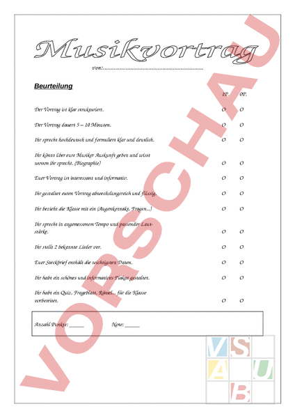 von: Beurteilung 1P. 0P. Der Vortrag ist klar strukturiert. Der Vortrag dauert 5 – 10 Minuten. Ihr sprecht hochdeutsch und formuliert klar und deutlich. Ihr könnt über eure Musiker Auskunft geben und wisst wovon ihr sprecht. (Biographie) Euer Vortrag ist interessant und informativ. Ihr gestaltet euren Vortrag abwechslungsreich und flüssig. Ihr bezieht die Klasse mit ein (Augenkontakt, Fragen.) Ihr sprecht in angemessenem Tempo und passender Laut stärke. Ihr stellt 2 bekannte Lieder vor. Euer Steckbrief enthält die wichtigsten Daten. Ihr habt ein schönes und informatives Plakat gestaltet. Ihr habt ein Quiz, Frageblatt, Rätsel. für die Klasse vorbereitet. Anzahl Punkte: Note: