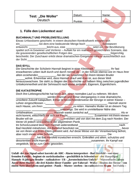 Test: „Die Wolke Deutsch Datum: Punkte: Name: Note: 1. Fülle den Lückentext aus! BUCHINHALT UND PROBLEMSTELLUNG Etwas Unfassbares geschieht: In einem deutschen Kernkraftwerk ereignet sich ein, bei dem eine bedeutende Menge hochSubstanzen entweicht. bricht aus, eine setzt ein. Die Bevölkerung spaltet sich in Gewinner und Verlierer – Auftakt für ein realistisch gezeichnetes Szenario, das die gravierenden gesellschaftlichen Folgen desfolgerichtig beschreibt. Der Zuschauer erlebt diese dramatischen Ereignisse nahezu ausschließlich aus der Sicht. DAS IDYLL Die Geschichte der Schülerin Hannah beginnt in einer Kleinstadt_. Ihr fast erwachsenes Leben läuft durch und durch normal ab – in der Schule ebenso wie im Haus ihrer allein erziehenden, bei der sie zusammen mit ihrem kleinen Bruder wohnt. Erkennbar wird, dass Hannah drauf und dran ist, aus dieser Welt herauszuwachsen. Sie steht zu Beginn der Geschichte auf halbem Weg zwischen jugendlicher Unbekümmertheit und der Sehnsucht nach etwas anderem, Eigenem, Eigentlichem. DIE KATASTROPHE Doch ihre Liebesgeschichte hat keine Zeit, einen normalen Lauf zu nehmen. Mit demwerden Hannah und Elmar übergangslos in eine dramatische, unsichere Zukunft katapultiert. Elmar ist bezeichnenderweise der Einzige in seiner Klasse – Lehrer eingeschlossen –_. Hannah stürmt nach Hause, um ihren zu retten. Hannahs Mutter ist an diesem Tag unterwegs. Sie wird in unmittelbarer Nähe des Unfallreaktors. Hannah wartet zunächst auf_. Als er nicht kommt, entschließt sie sich zur Flucht_. Zusammen mit ihrem kleinen Bruder will sie erreichen und von dort mit dem Zug nach Norden. Der kleine Uli jedoch wird während der allgemeinen Panik. Im Schockzustand lässt sich Hannah widerstrebendnach Bad Hersfeld mitnehmen. Am Bahnhof beschützt sie, bevor sie von ihnen und ihren Eltern getrennt wird. Auf diese Weise von der Verantwortung befreit, aber noch immer unter Schock,_. Die hat Bad Hersfeld inzwischen erreicht. Entkräftet und allein, schutzlos und desorientiert bricht Hannah zusammen. Ihr Kampf war vergeblich, sie ist zum Opfer geworden. Unfall- der das Signal sofort korrekt als ABC- Alarm interpretiert Bad Hersfeld von einer fremden Familie beginnt sie zurückzulaufen – geschäftlich in Schweinfurt der Hauptfigur Hannah- 8-jährigen Bruder radioaktiver- Uli „kerntechnischen Unfalls Massenflucht –einen Anruf ihrer Mutter die drei Kinder dieser Familie per Fahrrad Wolke Heulen der Sirene von einem Auto überfahren und getötet Panik – Mutter- sterben im radioaktiven Regen bei Fulda –