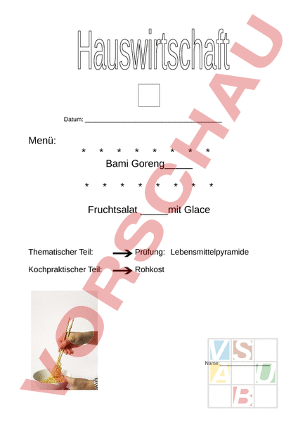 Datum: Menü: * * Bami Goreng_ * Fruchtsalatmit Glace Thematischer Teil: Prüfung: Lebensmittelpyramide Kochpraktischer Teil: Rohkost Name: