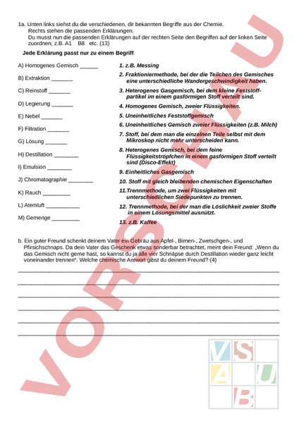 1a. Unten links siehst du die verschiedenen, dir bekannten Begriffe aus der Chemie. Rechts stehen die passenden Erklärungen. Du musst nun die passenden Erklärungen auf der rechten Seite den Begriffen auf der linken Seite zuordnen; z.B. A1 B8 etc. (13) Jede Erklärung passt nur zu einem Begriff. A) Homogenes Gemisch 1. z.B. Messing B) Extraktion 2. Fraktioniermethode, bei der die Teilchen des Gemisches eine unterschiedliche Wandergeschwindigkeit haben. C) Reinstoff 3. Heterogenes Gasgemisch, bei dem kleine Feststoffpartikel im einem gasförmigen Stoff verteilt sind. D) Legierung 4. Homogenes Gemisch, zweier Flüssigkeiten. E) Nebel 5. Uneinheitliches Feststoffgemisch F) Filtration G) Lösung H) Destillation I) Emulsion 6. Uneinheitliches Gemisch zweier Flüssigkeiten (z.B. Milch) 7. Stoff, bei dem man die einzelnen Teile selbst mit dem Mikroskop nicht mehr unterscheiden kann. 8. Heterogenes Gemisch, bei dem feine Flüssigkeitströpfchen in einem gasförmigen Stoff verteilt sind (Disco-Effekt) 9. Einheitliches Gasgemisch J) Chromatographie 10. Stoff mit gleich bleibenden chemischen Eigenschaften K) Rauch 11.Trennmethode, um zwei Flüssigkeiten mit unterschiedlichen Siedepunkten zu trennen. L) Atemluft 12. Trennmethode, bei der man die Löslichkeit zweier Stoffe in einem Lösungsmittel ausnützt. M) Gemenge 13. z.B. Kaffee b. Ein guter Freund schenkt deinem Vater ein Gebräu aus Apfel-, Birnen-, Zwetschgen-, und Pfirsichschnaps. Da dein Vater das Geschenk etwas sonderbar betrachtet, meint dein Freund: „Wenn du das Gemisch nicht gerne hast, so kannst du ja alle vier Schnäpse durch Destillation wieder ganz leicht voneinander trennen. Welche chemische Antwort gibst du deinem Freund? (4) 2a. Du hast den Aufbau der homogenen und heterogenen Stoffgemische mit Hilfe des Teilchenmodells kennen gelernt. Fülle die nachfolgenden Bilder aus, indem du die fehlenden Teilchenmodelle, die Bezeichnungen für die Art des Stoffgemisches (homogen – heterogen), die allgemeinen Stoffbezeichnungen und die Beispiele da einfügst, wo sie fehlen. (18) b. Schreibe hinter die folgenden Aussagen richtig oder falsch: (6) • Ein Reinstoff hat immer gleichbleibende physikalischen Eigenschaften. • Ein Reinstoff befindet sich immer im gleichen Aggregatszustand. • Alle Elemente des Periodensystems sind Reinstoffe. • Alle Reinstoffe findet man auch im Periodensystem. • Fraktionieren und analysieren sind chemisch gleichbedeutend. • Mischen und synthetisieren sind gegensätzliche Verfahren. c. Wenn du dir einen Tee zubereitest, so nützt du zwei chemische Trennverfahren aus, um zu deinem Getränk zu kommen. Beschreibe kurz mit den entsprechenden Fachbegriffen die Trennverfahren und gib auch jeweils die physikalischen Stoffeigenschaften an, die dir diese Trennverfahren ermöglichen. (4) 3a. Fülle nachfolgenden Lückentext mit den entsprechenden Fachbegriffen aus: (14) Der Engländer John Dalton erneuerte im 19.Jh die Atomlehre mit den Aussagen, dass die Elemente aus kleinsten Teilchen, den Atomen, bestehen, deren Eigenschaften sich bei oder Vorgängen nicht ändern. Rutherford experimentierte mit Strahlung, die er mit Hilfe eines in ihre Teilchenstrahlen zerlegte. Die meisten der geladenen -Teilchen durchdrangen die ohne Reaktion, ein paar wurden abgelenkt und ein paar wenige wurden sogar. Aufgrund der Ergebnisse folgerte er, dass Atome ein Massenzentrum mit, dem Atomkern, haben müssen. Dieser Kern enthält mehr als% der Masse, ist aber 10000 mal als das Atom selber. Da das Atom selber elektrisch ist, bewegen sich um den Atomkern geladene Teilchen, die b. Nachfolgend siehst du ein Beispiel, wie man die Atome eines Elementes und seine Elementarteilchen darstellen kann. Ergänze die folgenden Atome mit den fehlenden Angaben genau so wie im Muster oben. (12) Magnesium-Atom VII Hauptgruppe, 3.Periode I. Hauptgruppe, 1.Periode c. Was versteht man unter der Ordnungszahl? (2) 4. Nachfolgend siehst du die vier der 8 Hauptgruppen und darunter ganz viele Begriffe. Schreibe die einzelnen Begriffe über dort ein, wo sie dazugehören. (29) Achtung!! Einzeln Begriffe können auch in mehreren Spalten stehen. Halogene Alkalimetalle Erdalkalimetalle Edelgase feste, flüssige und gasförmige Elemente bei RT Marmor und Kreide „glückliche Elemente Wunddesinfektion besitzen eine 7.Schale sehr weiche Metalle reagieren heftig mit Wasser schmerzhafte Verbrennungen auf der Haut Leuchtstoffröhren Schutzgas zum Schweissen 2 Valenzelektronen 7 Valenzelektronen kommen in der Natur nur als Salzverbindungen vor Atommasse 133u das Stinkende Magnesia wenige Verbindungen Hallenbaddesinfektion Fr 2 sind bei RT gasförmig werden in Petroleum aufbewahrt Viel Erfolg und gute Nerven!!!!!!!!!!!!! Kochsalz Luftschiffe reaktionsträge