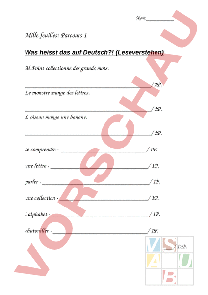 Nom: Mille feuilles: Parcours 1 Was heisst das auf Deutsch?! (Leseverstehen) M.Point collectionne des grands mots. / 2P. Le monstre mange des lettres. / 2P. oiseau mange une banane. / 2P. se comprendre / 1P. une lettre / 1P. parler / 1P. une collection / 1P. alphabet / 1P. chatouiller / 1P./ 12P. Was heisst das auf Deutsch? (Hörverstehen) Lehrerblatt (Schülerblatt Seite 3!) 1.) M.Point collectionne des velos. (2P.) 2.) Non! M.Points collectionne des grands mots. (2P.) 3.) Le monstre mange un cervelas.(2P.) 4.) Haut les mains! (1P) 5.) Sans (ohne) mots impossible (unmöglich) de parler! (2P.) 6.) Il faut (Man muss) chatouiller le monstre! (1P.) 7.) une collection (1P.) 8.) se comprendre (1P.) 12 Punkte Was heisst das auf Deutsch? Höre genau hin! (Hörverstehen) 1.) 2P. 2.)/ 2P. 3.)_ 2P. 4.)/ 1P. 5.)/ 2P. 6.)/ 1P. 7.)/ 1P. 8.)/ 1P. / 12P.