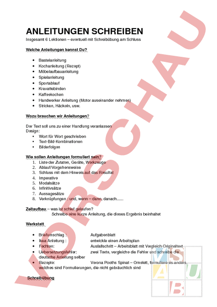 ANLEITUNGEN SCHREIBEN Insgesamt 6 Lektionen – eventuell mit Schreibübung am Schluss Welche Anleitungen kennst Du? • • • • • • • • • Bastelanleitung Kochanleitung (Rezept) Möbelaufbauanleitung Spielanleitung Sportablauf Kravattebinden Kaffeekochen Handwerker Anleitung (Motor auseinander nehmen) Stricken, Häckeln, usw. Wozu brauchen wir Anleitungen? Der Text soll uns zu einer Handlung veranlassen Design: • Wort für Wort geschrieben • TextBildKombinationen • Bilderfolgen Wie sollen Anleitungen formuliert sein? 1. Liste der Zutaten, Geräte, Werkzeuge 2. Ablauf/Vorgehensweise 3. Schluss mit dem Hinweis auf das Resultat 4. Imperative 5. Modalsätze 6. Infinitivsätze 7. Aussagesätze 8. Verknüpfungen und, wenn – dann, danach Zeltaufbau – was ist schief gelaufen? Schreibe eine kurze Anleitung, die dieses Ergebnis beinhaltet Werkstatt • • • • • Briefumschlag Aufgabenblatt Ikea Anleitung entwickle einen Arbeitsplan Fechten: Ausfallschritt – Arbeitsblatt mit Vergleich Originaltext Uebersetzungsfehler: zwei Texte, vergleiche die Fehler und schreibe die deutsche Anleitung selber Rezepte: Verona Pooths Spinat – Omelett, formuliere es anders, welches sind Formulierungen, die nicht gebräuchlich sind Schreibübung Schreibe eine Anleitung zu folgender Bilder Folge